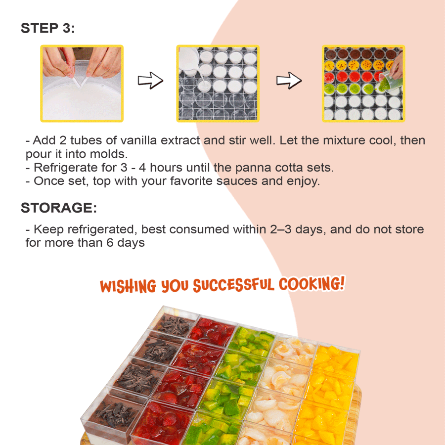 - Set Panna Cotta chưa nấu chỉ cần bảo quản nơi khô thoáng mát, tránh ánh nắng trực tiếp.
